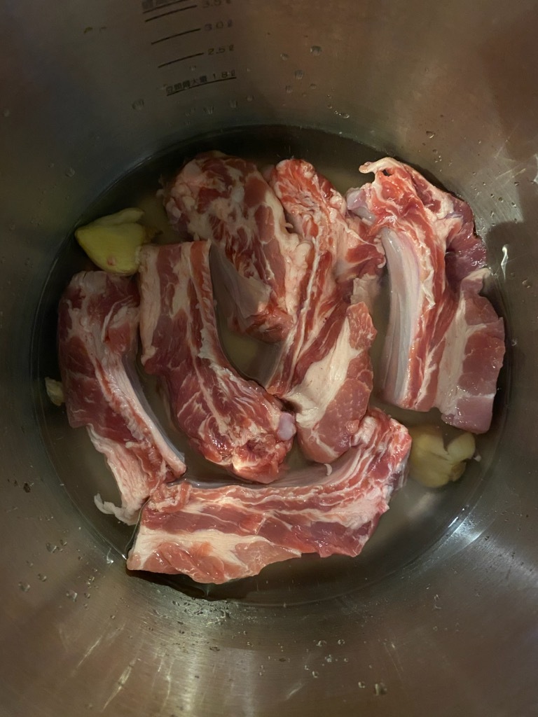 圧力鍋にスペアリブ、つぶしたにんにく、水を入れ蓋をして火にかける。