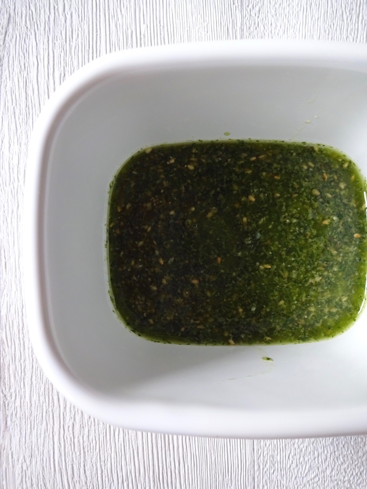 青紫蘇を白胡麻と菜種油と一緒にフードプロセッサーにかけて作る自家製ソースです。調味付けは薄口醤油と胡麻油のみ。シンプルだけど濃厚な味わいは素材を活かし、和食にも洋食にも合うレシピ。作ってから一週間ほど美味しく召し上がって頂けます。