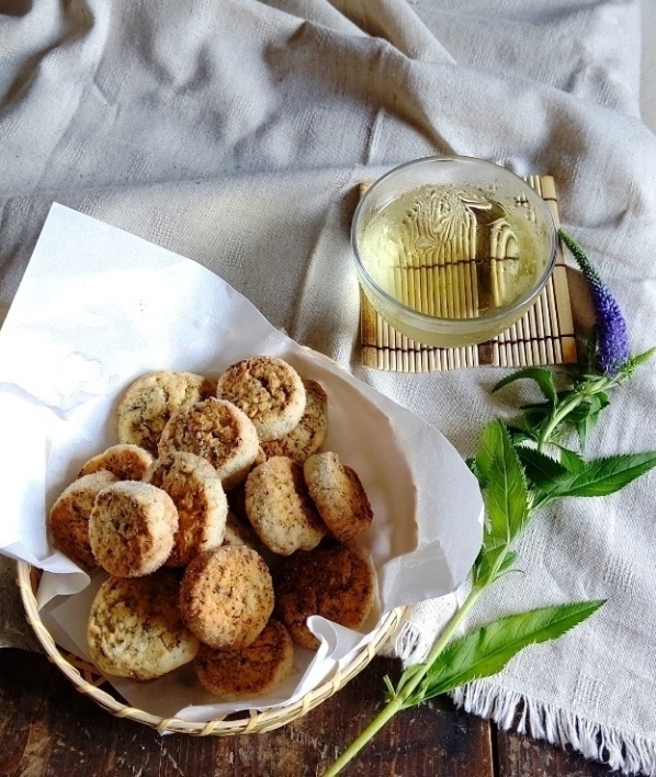 赤しそふりかけを使った、サクサクとした食感の、和風な甘じょっぱいクッキーです。塩けもあるのでお酒にも合いそうです。