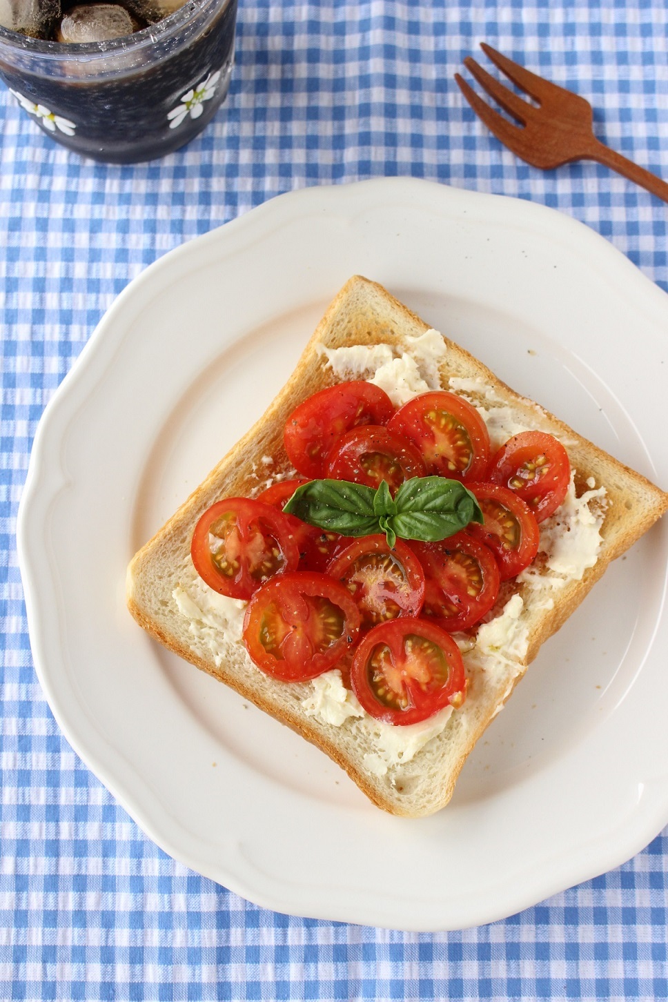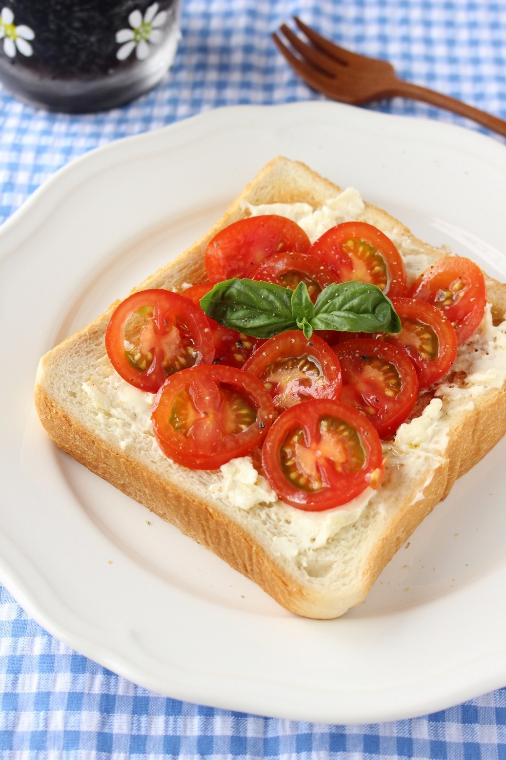 フレッシュなトマトを乗せた爽やかなトースト。クリームチーズのコクとマリネしたトマトのさっぱり感が食欲をそそります。