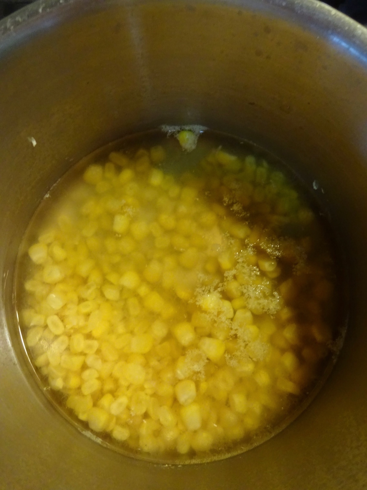 鍋にとうもろこしと水を入れて中火にかけ、一煮立ちしたらアクをりコンソメを加えて混ぜ合わせる。