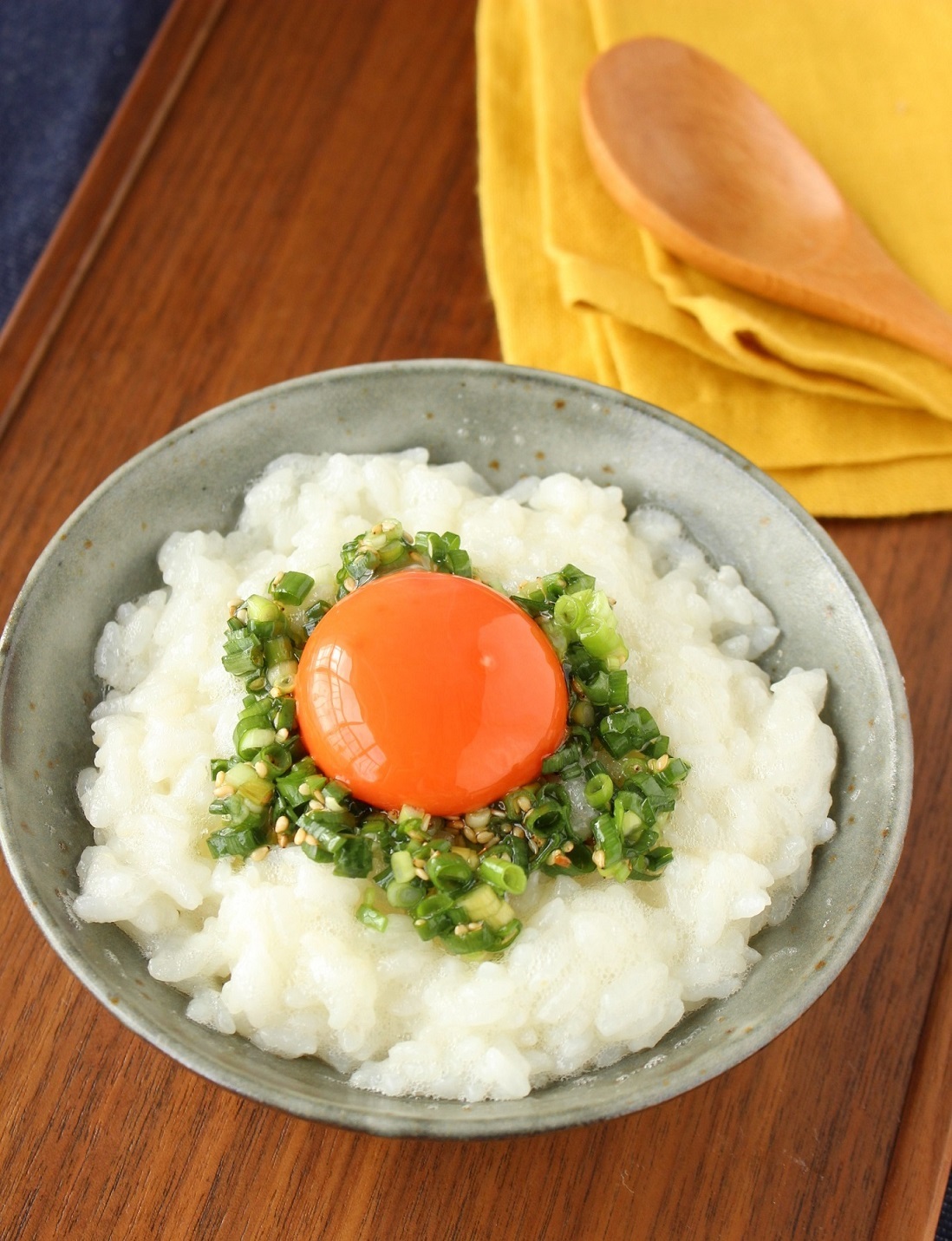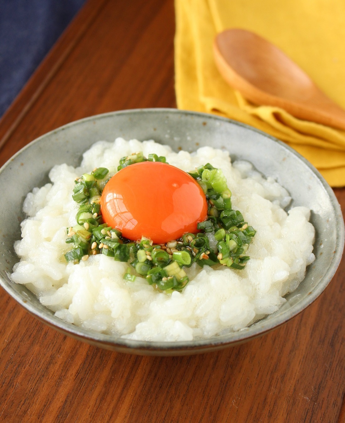 - ご飯を器に盛り卵白を入れ白っぽくなるまでよくかき混ぜ、万能ねぎをのせ、卵黄をのせる。