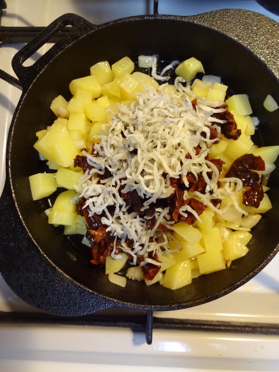 スキレットにオリーブオイルを注いで中火にかけ、オイルが全体に回ったら玉ねぎ→ジャガイモの順に炒め、ジャガイモに火が通ったらドライトマトとちりめんじゃこを加えて混ぜ合わせる。