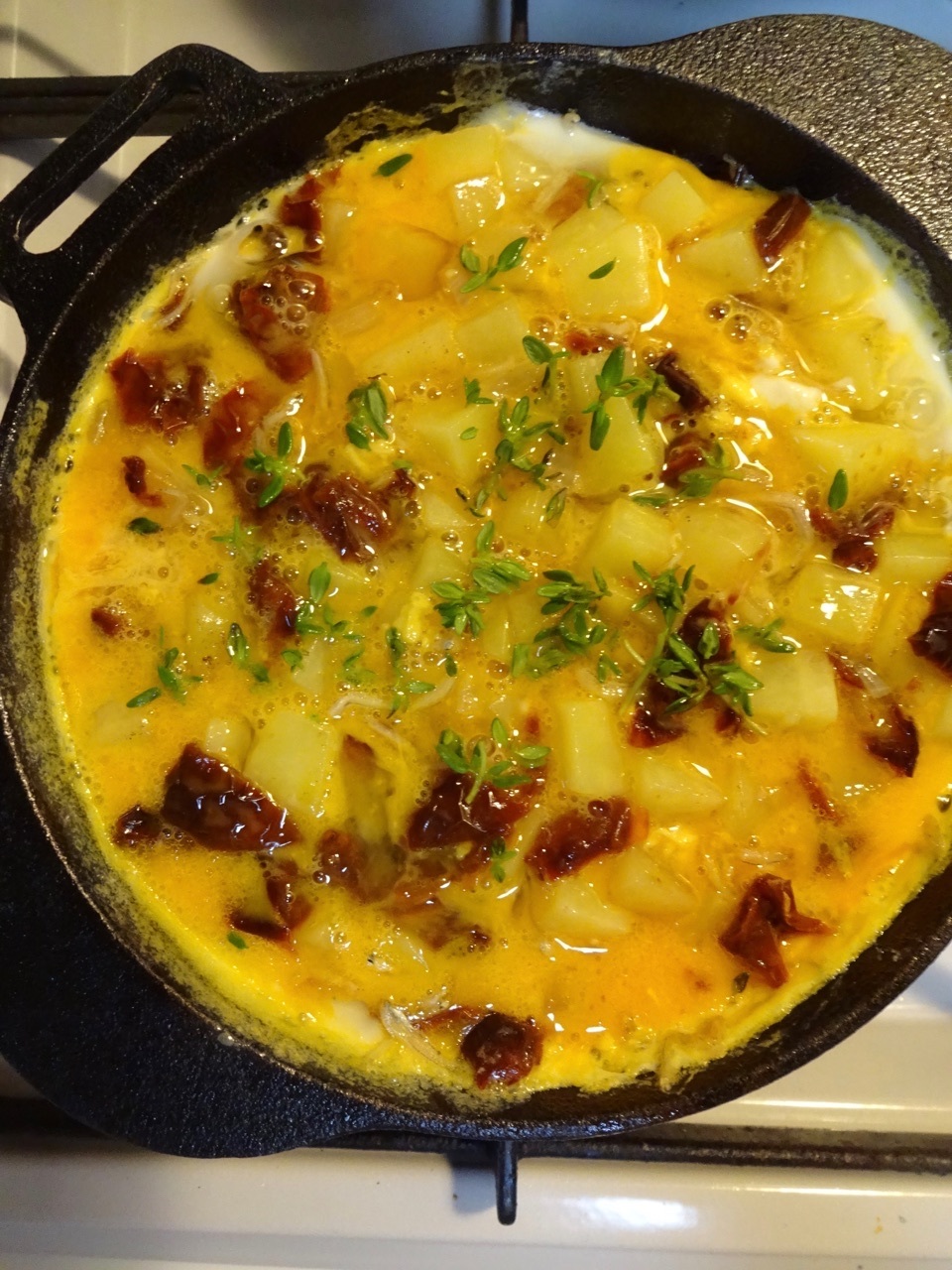 たまごを溶き、2に加えてざっくりと混ぜ合わせてタイムを散りばめる。弱火にしてフタをし、火が通るまで15分焼いたらスキレットのまま食卓に上げる。