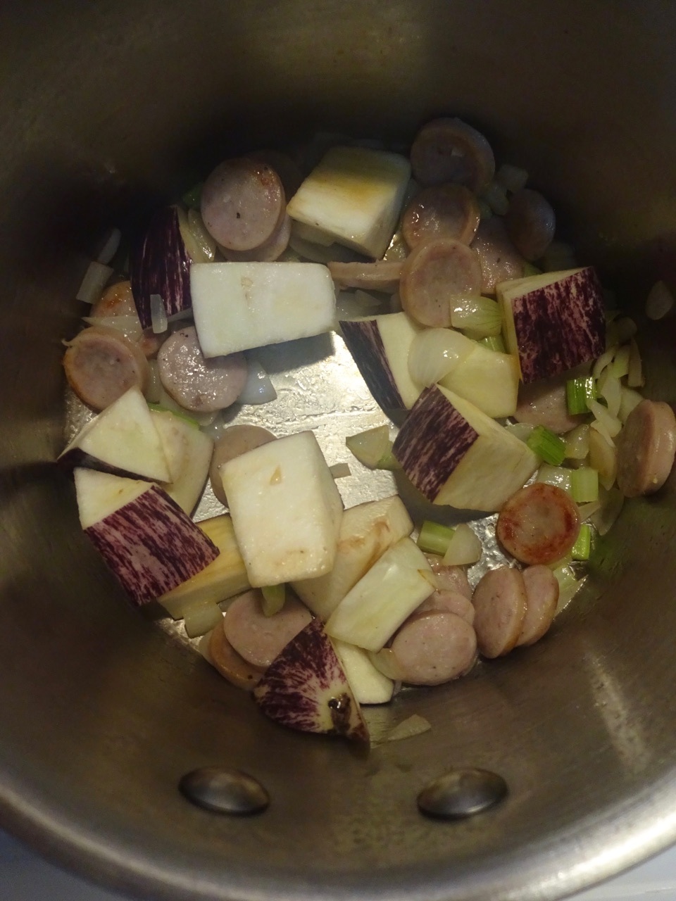 - 【下準備】モロッコインゲンは塩(分量外)を入れた湯で2分下茹でして氷水に取り、粗熱が取れたら水気を切って2cm長に切る。イタリアン茄子は2〜3cm大に切る。玉ねぎとセロリは粗めのみじん切りにする。ソーセージは0.5cm厚の輪切りにする。