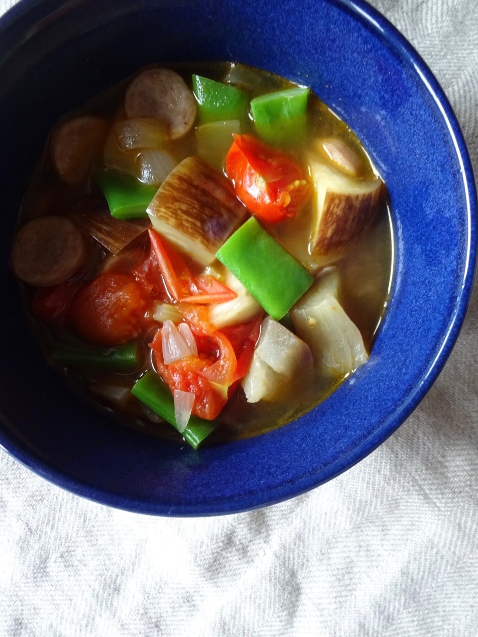 ソーセージとドライトマトの戻し汁で出汁いらず!イタリアン茄子とモロッコインゲンを使ったお洒落なミネストローネ。