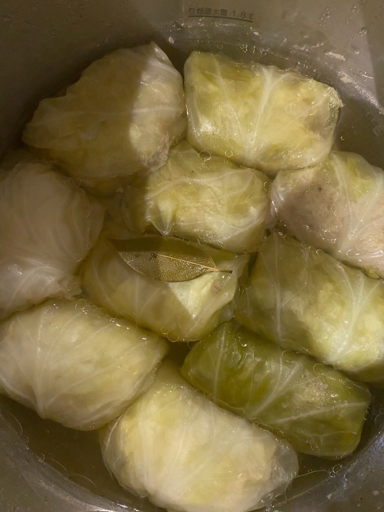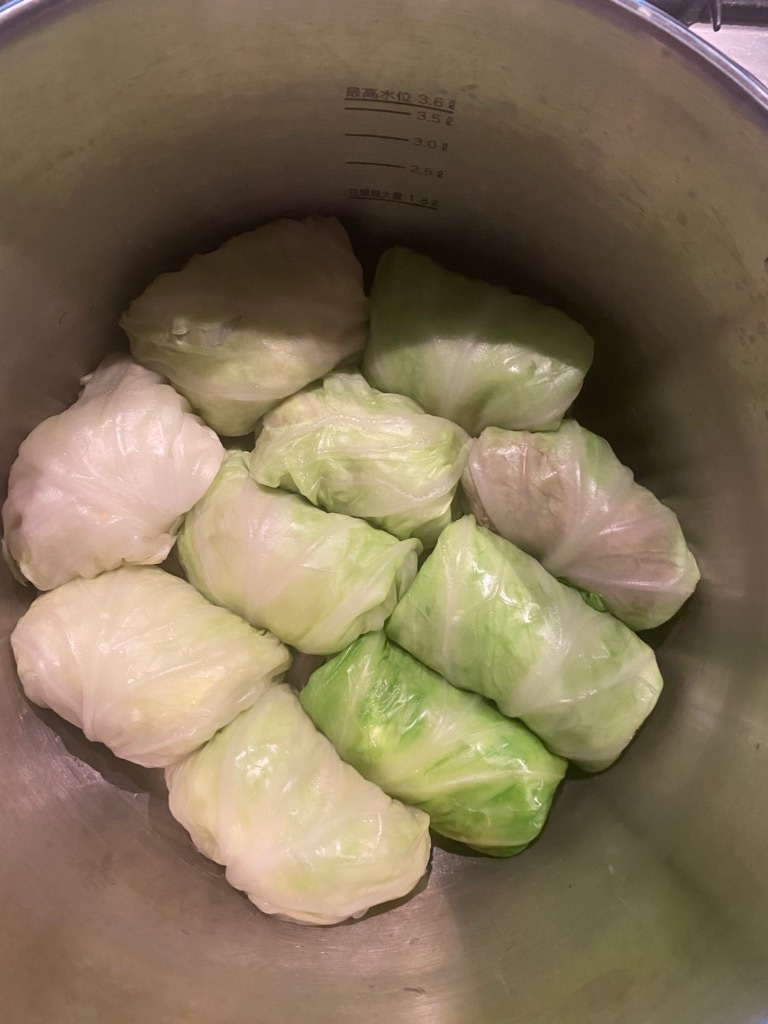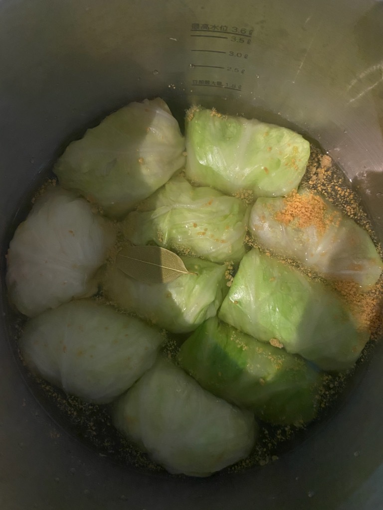 キャベツの葉に3の具をのせて包んだら圧力鍋に並べる。
