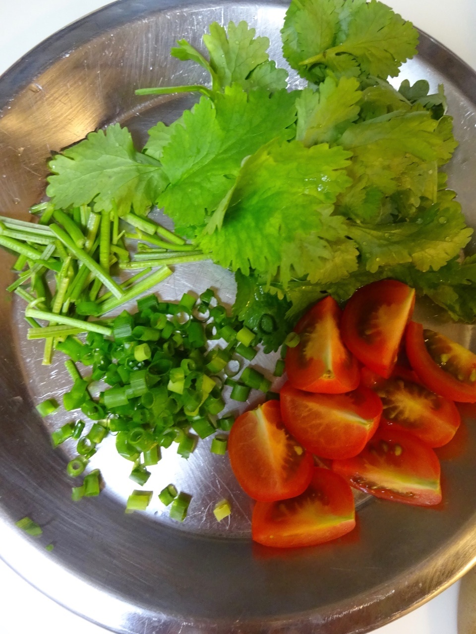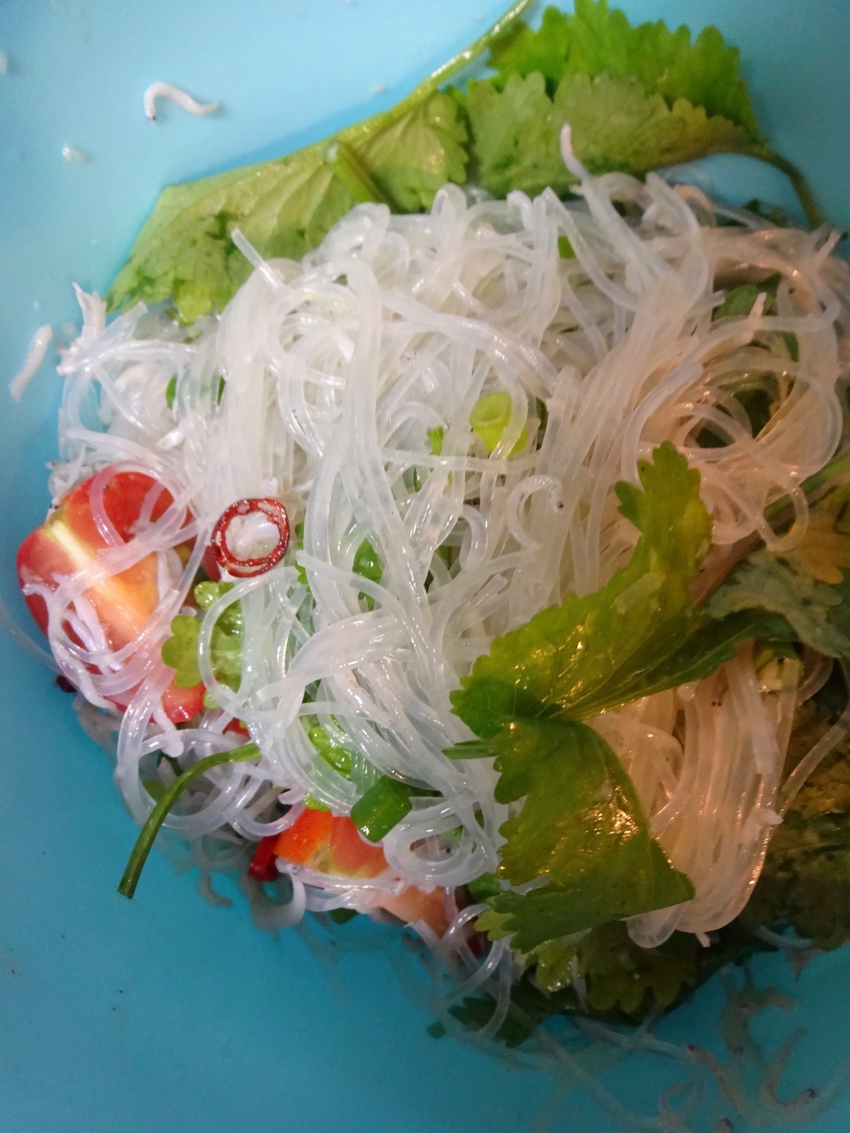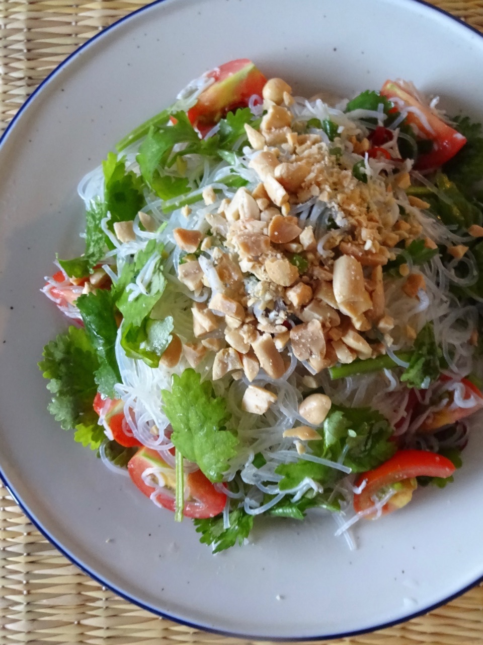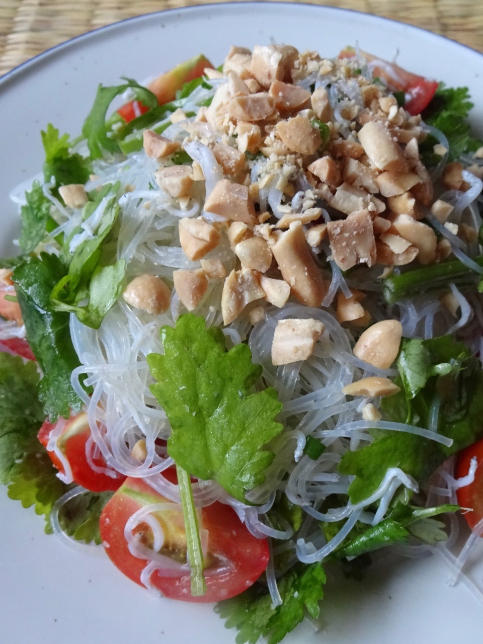 【下準備】春雨は規定時間茹でて食べやすい長さに切って水気を切る。トマトは1/4のくし切りにする。パクチーは葉と茎に分けて茎を3cm長に切る。万能ネギは0.5cm長に切る。ピーナッツは粗めのみじん切りにする。