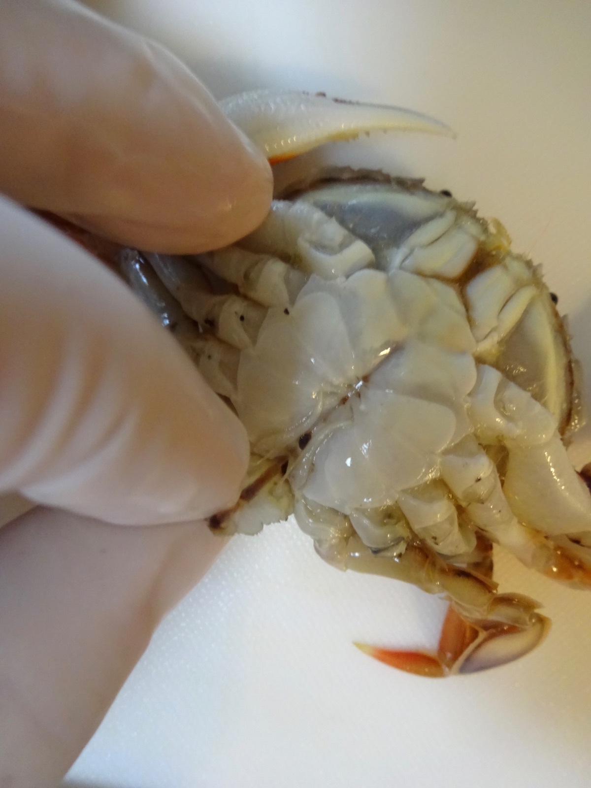 【下準備】ニンニクはみじん切りにする。トマトは1/8のくし切りにする。丸ガニはたわしで表面を洗い、ハカマを取り除いて縦半分に切る。
