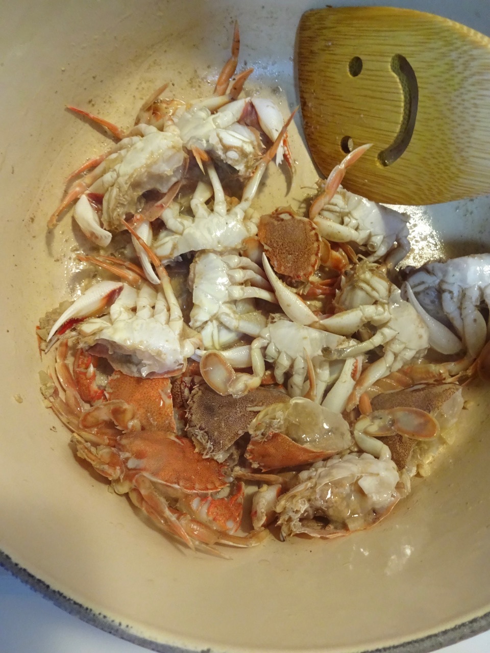 鍋にごま油を注いで中火にかけ、ニンニクを入れて香りが立ったら丸ガニと酒・塩を加えて炒める。