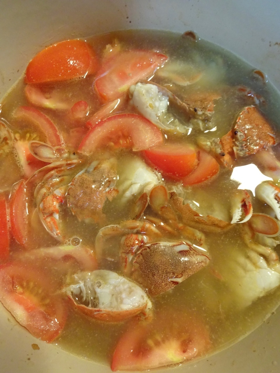 丸ガニの色が赤く変わり、油が馴染んだらトマトを加えて一混ぜし、水を加える。