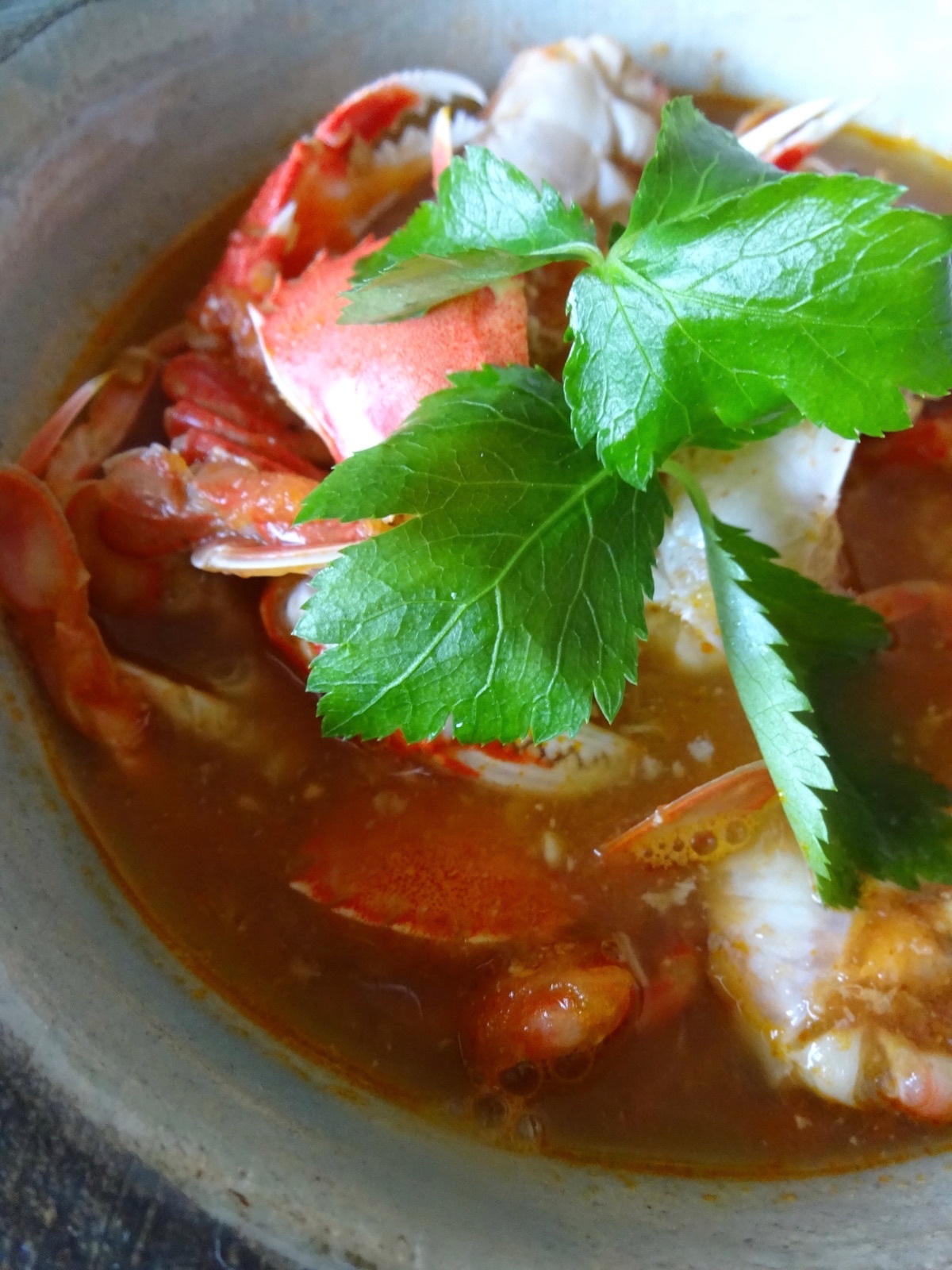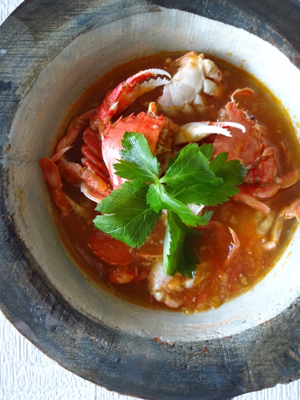 リーズナブルで美味しい出汁が出る丸ガニをトマトと一緒に煮込んでつくる濃厚なキムチスープ。