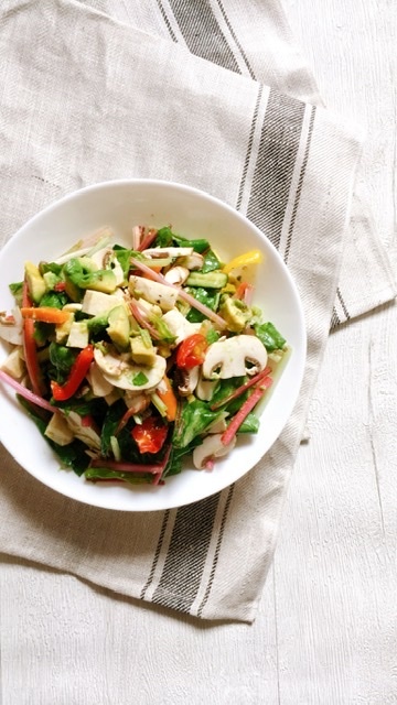 - スイチャードの茎は2cm幅に切る。葉は食べやすい大きさに切る。アボカドは角切りにし、レモン汁をふりかける。マッシュルームは石づきを落とし、薄切りにする。人参は縦半分に切り、細切りにする。赤パプリカ、黄パプリカは2cm幅に切る。ミニトマトは4等分に切る。