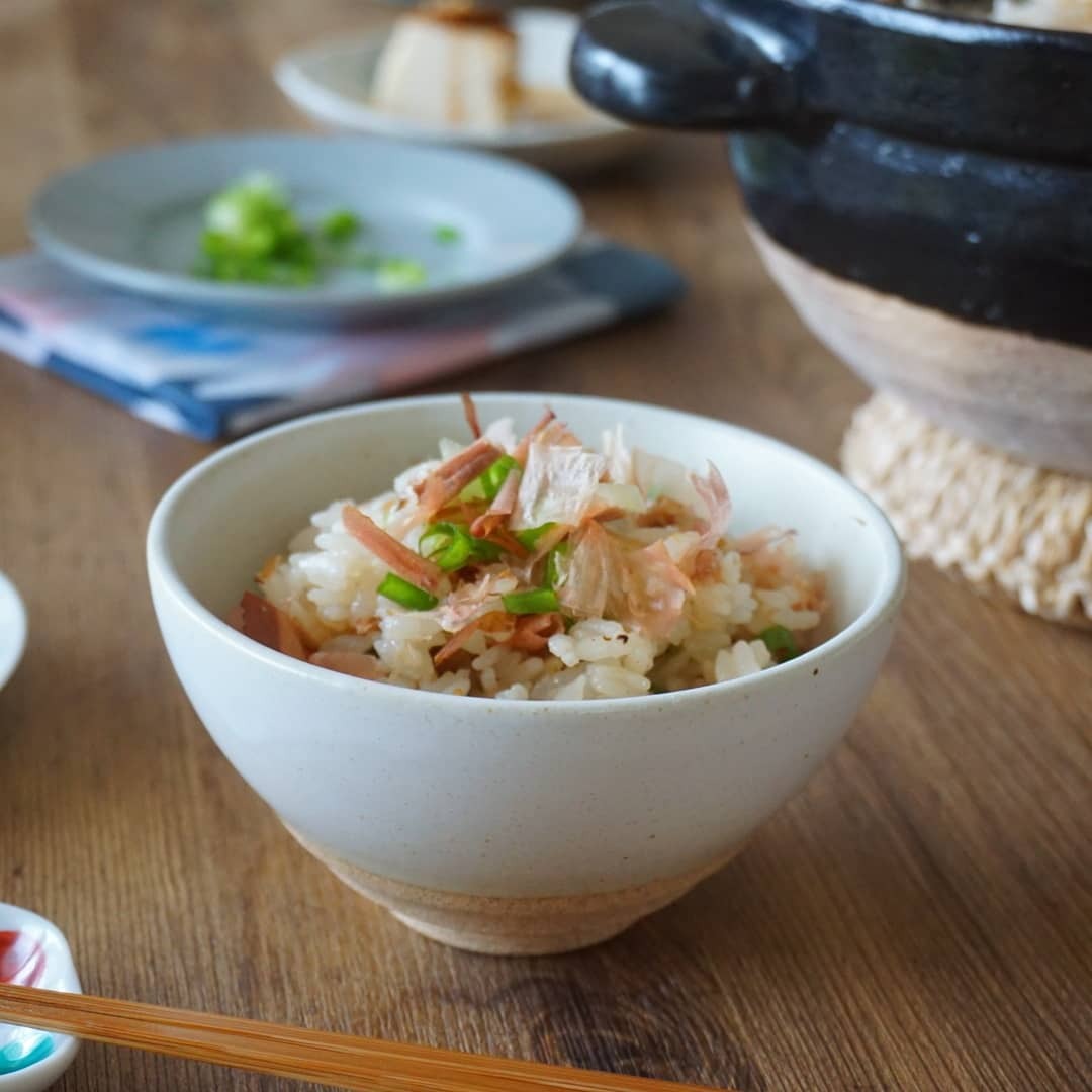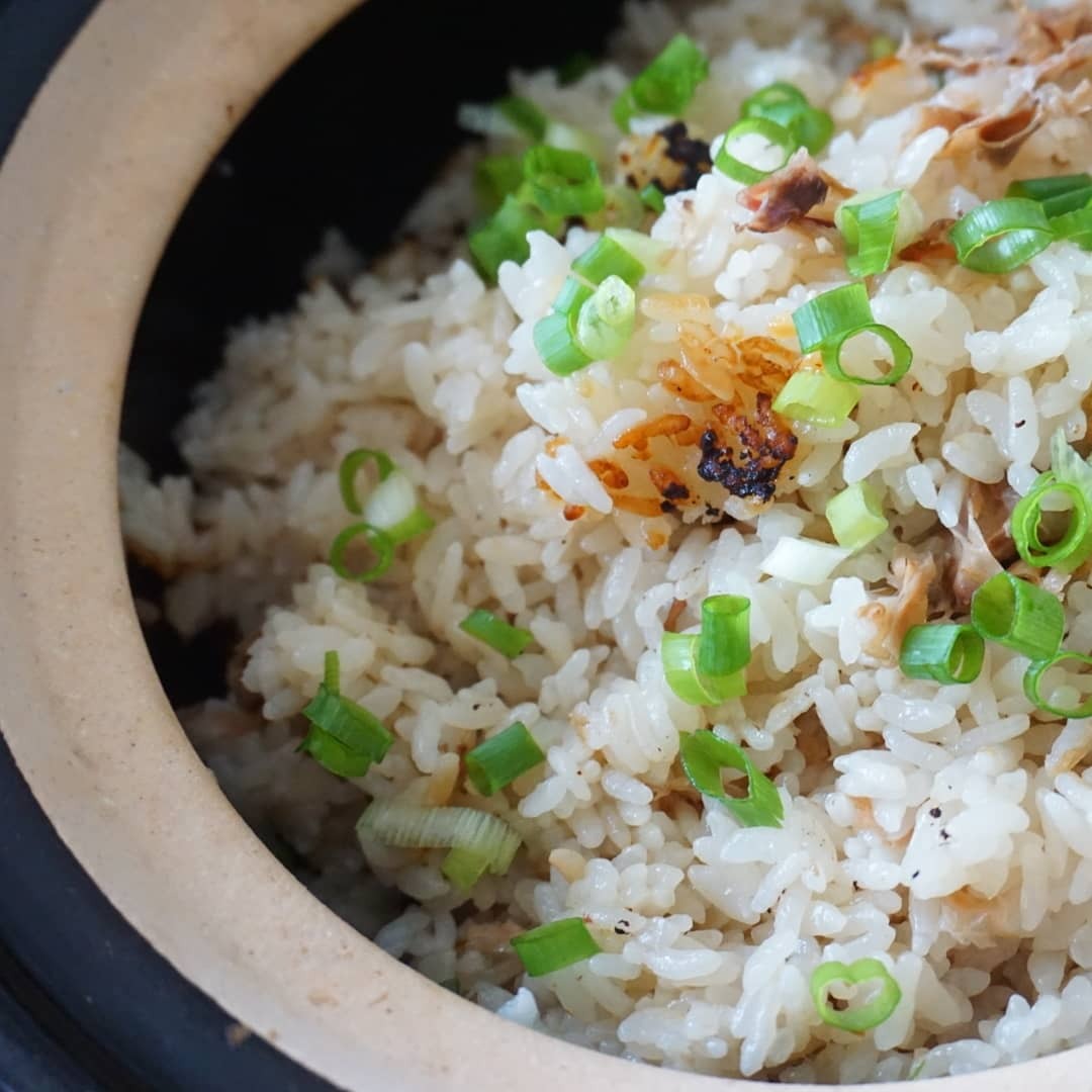 - ごはんを軽く混ぜ、かつおぶし、青ネギをのせる