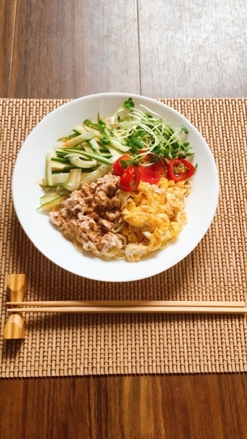 きゅうりの細切りが面倒くさい方は、かいわれだけでも良いと思います。スクランブルエッグは冷ましてから麺の上に盛り付けてください。