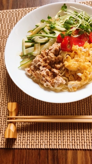 冷やし中華の具は錦糸卵を作ったり、ハムを切ったり意外と手間がかかります。そのため卵はスクランブルエッグにし、ハムの代わりにそのまま使えるシーチキンで代用しました。