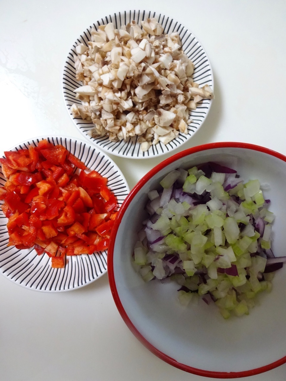 【下準備】玄米は軽く洗ってから炊飯器の規定量の水を加えて炊く。バジルはざく切りにする。その他の野菜はみじん切りにする。Aを混ぜ合わせる。
