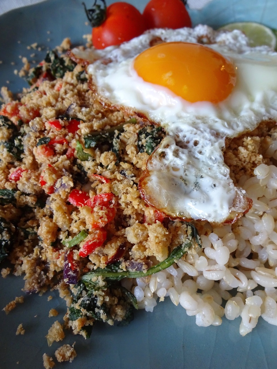 タイの炒め料理「ガパオ」をおからで作るエスニックのヘルシーメニュー。お肉を入れない代わりに、たくさんの種類の野菜を入れて旨味を出し、よりヘルシーに!