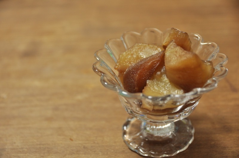弱火でコトコト煮ると、りんごの水分が出てきて蒸し煮になります。かき混ぜずに煮ると、バルサミコ酢の味の濃淡ができて変化を楽しめます。