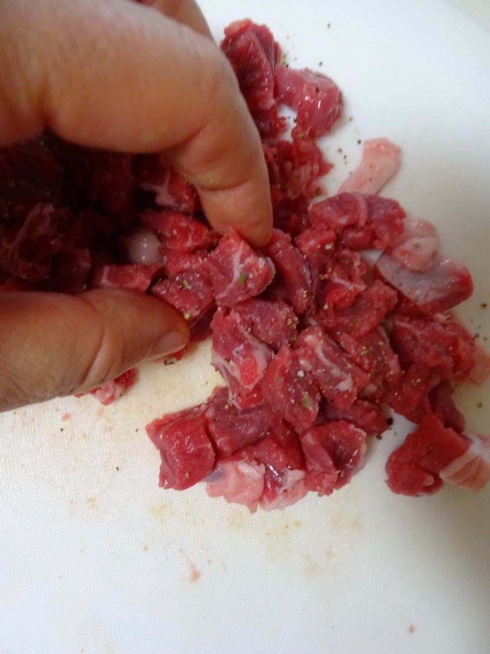 【下準備】牛ステーキ肉は粗めのみじん切りにしてハーブソルトをまぶして揉み込む。ドライいちじく、玉ねぎ、ニンニクはみじん切りにする。