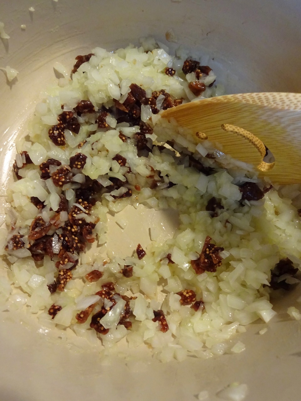 鍋にオリーブオイルを注いで弱中火にかけ、ニンニク→玉ねぎ→ドライいちじくの順に炒めて塩とブラックペッパーで調味する。バターを加えて牛ステーキ肉を入れて肉の色が変わり火が通るまで更に炒める。