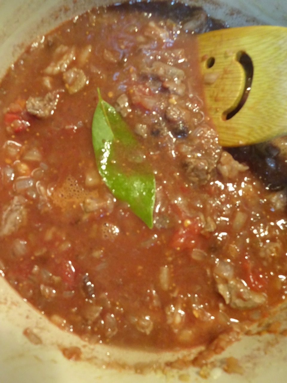 2にBを加えてホールトマトを潰しながら全体を混ぜ合わせ、味を見て足りないようであれば塩とブラックペッパーを加えて弱火にし、30分煮込む。