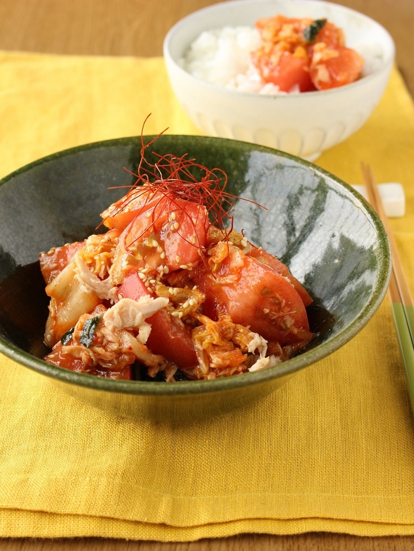 トマト+キムチ+ツナを和えるだけ。 爽やかなトマトの酸味にピリ辛キムチ+ツナの旨味をさらにプラスしてご飯が進むひと品に。暑い夏にピッタリなサッとひと品です。