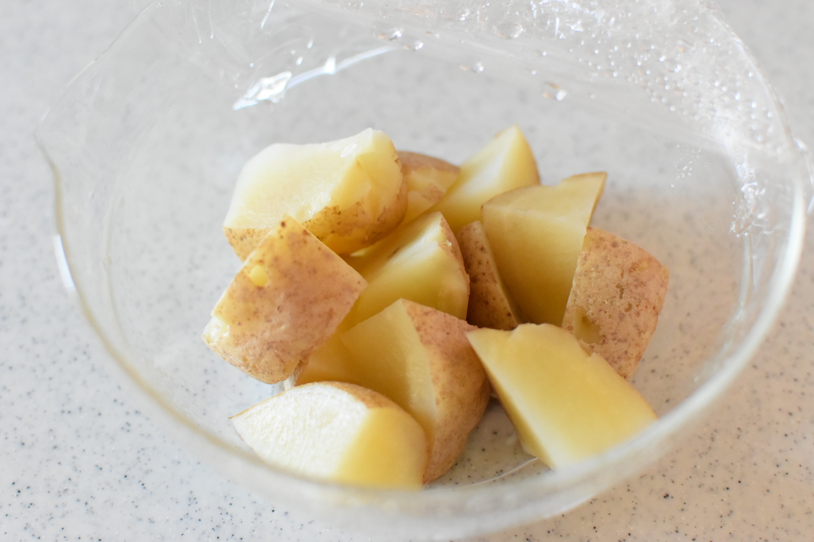 じゃがいもは芽を取り、一口大に切る。耐熱ボウルに入れ600Wの電子レンジで5分加熱する。粗熱が取れたら水気を拭き取る。