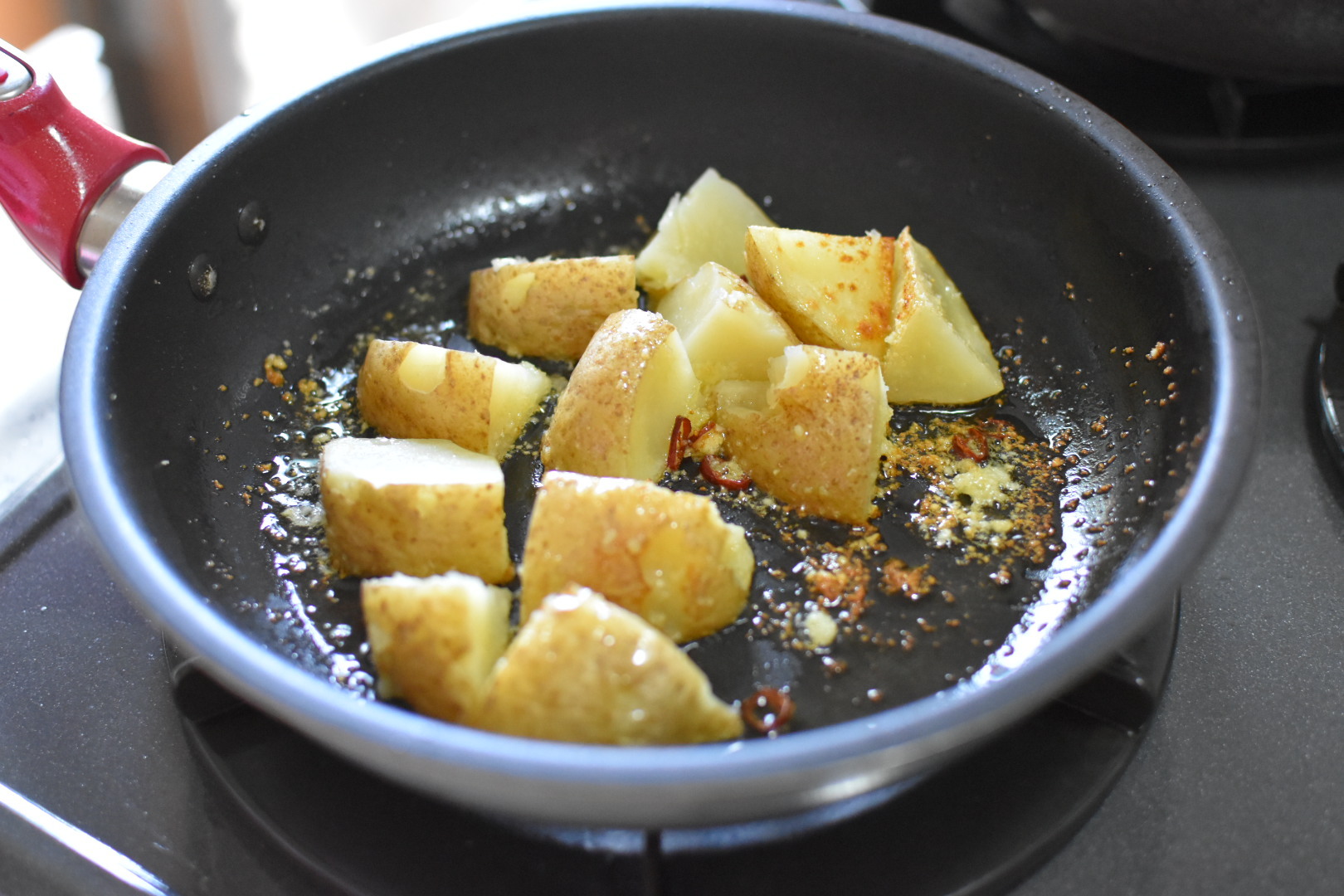 ★じゃがいもは電子レンジで加熱してから炒めることで、時短に。加熱後は、水気をよく拭き取ることで油のハネを防止。