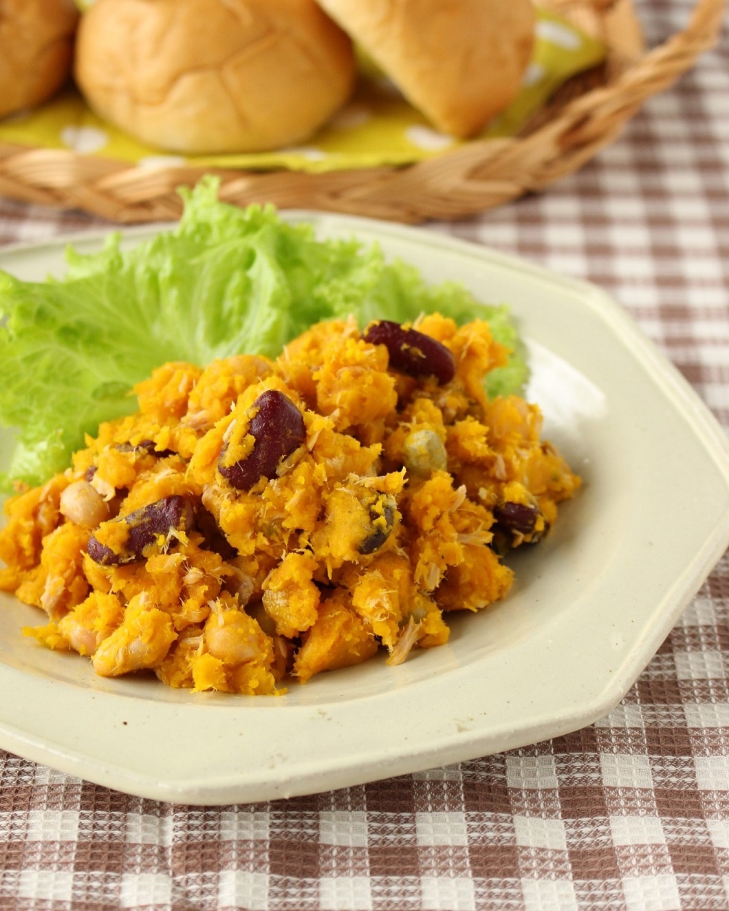 かぼちゃの優しい甘さにホクホクとした豆の食感がアクセント。ツナの旨味でおかずにもなるひと品。混ぜるだけの簡単レシピです。