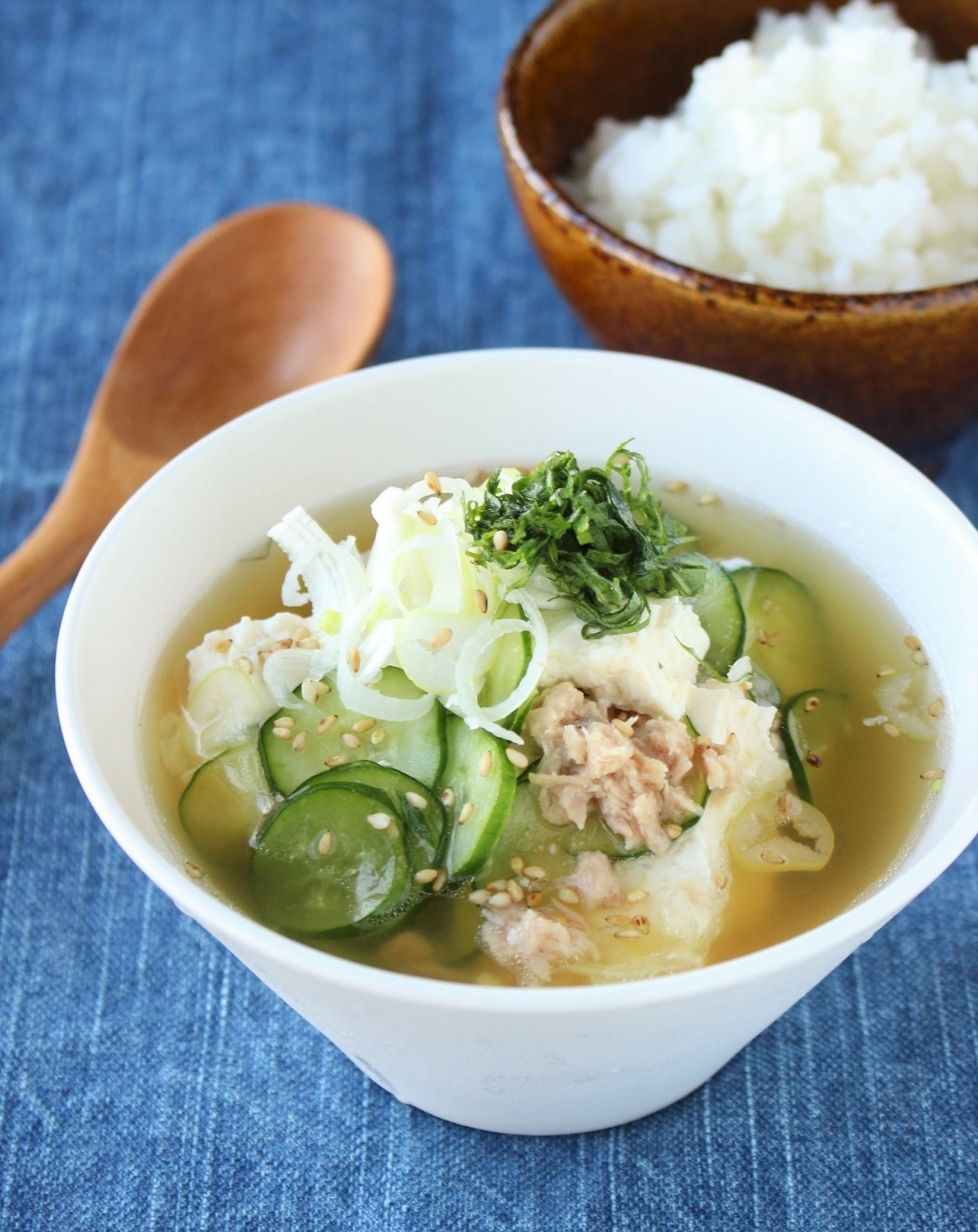 - だし汁に味噌を溶かし、豆腐をちぎりながら入れ、きゅうり・ツナを入れる。