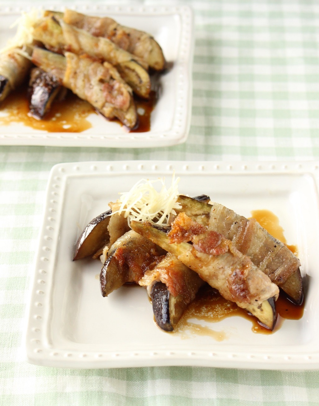 - 豚バラ肉に塩・こしょうをし、薄力粉を薄くまぶし、なすを乗せ巻く。
