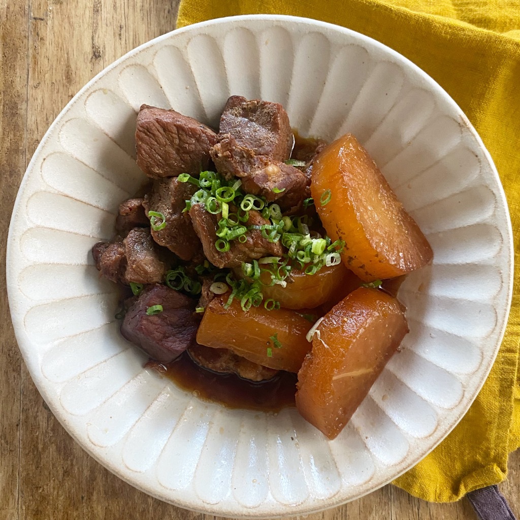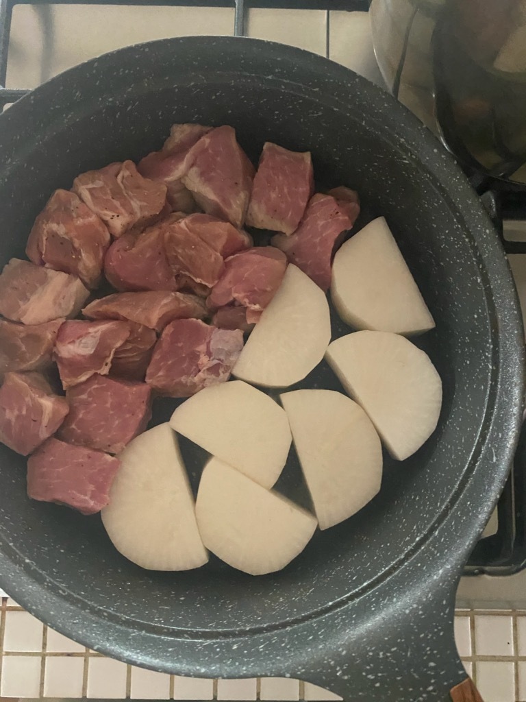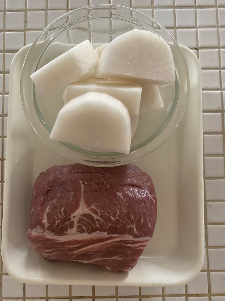 肉は3cm角に切り、大根は皮をむいて2cm厚の半月切りにする。