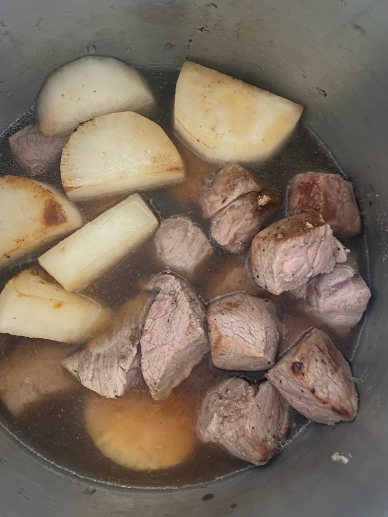 焼き色がついたら圧力鍋(魔法のクイック料理)に入れ、Aを入れ水をひたひたに入れる。(水は1と1/2~2カップくらい)
