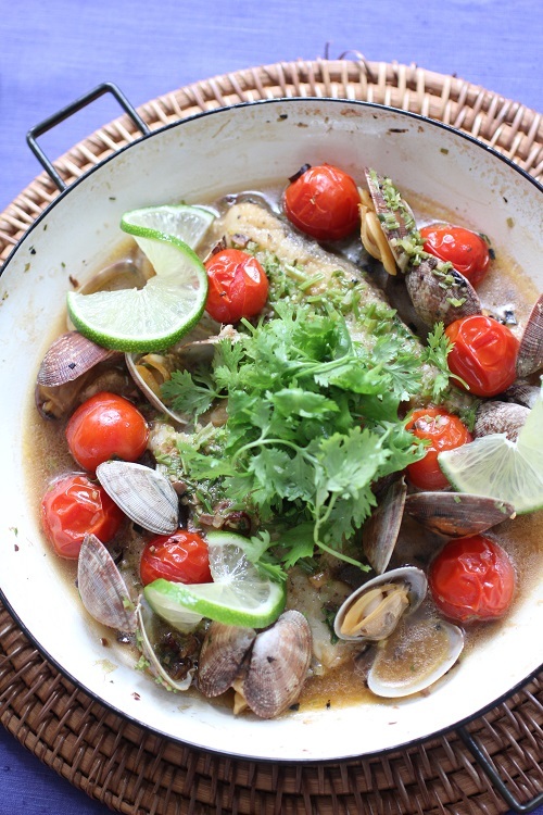 - 行程3にアクアパッツァのパクチーの茎、あさり、ミニトマト、白ワイン、ナンプラーを入れ蓋をし、魚に火が通るまで中火で約6分加熱する。