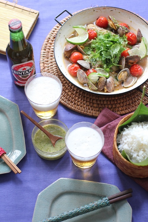 ナンプラーを加えることで、いつものアクアパッツァがエスニック料理に大変身。パクチーとピーナッツのソースがいいアクセントに。締めは、残ったスープでリゾットに。