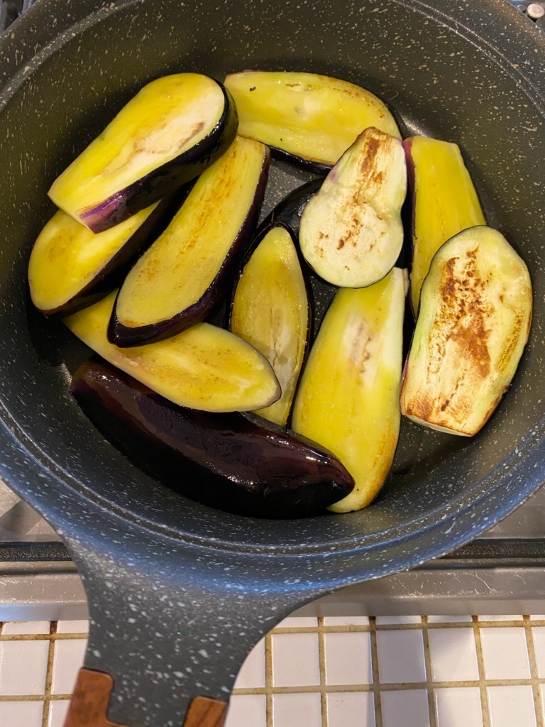 なすは縦に4~5等分して切り、オリーブ油を熱したフライパンで両面焼き、塩、胡椒をふる。
