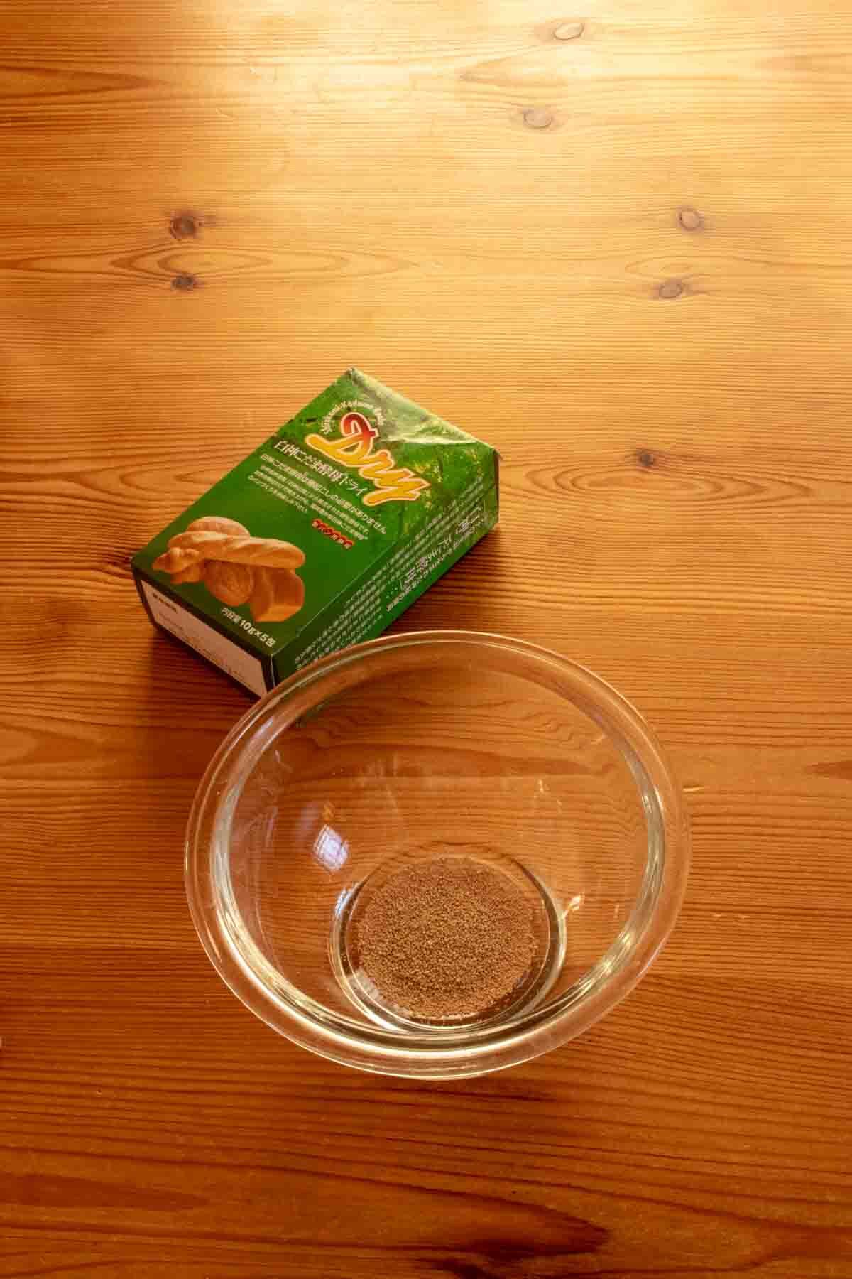 ・材料Bの(水(35℃〜40℃)に白神こだま酵母(インスタントドライイーストでもOK))を加え溶かす。