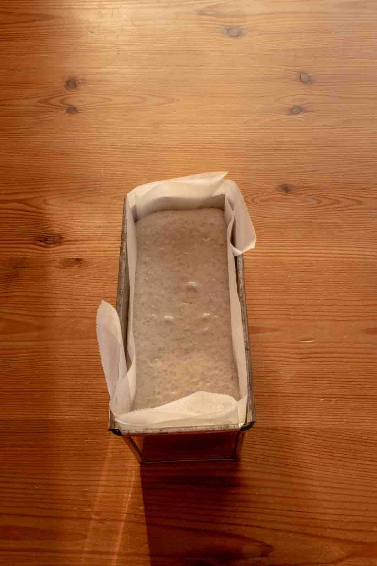 型に流し、ラップをして暖かいところ(あれば発酵機)で発酵させる。2倍程度に発酵したらOK。