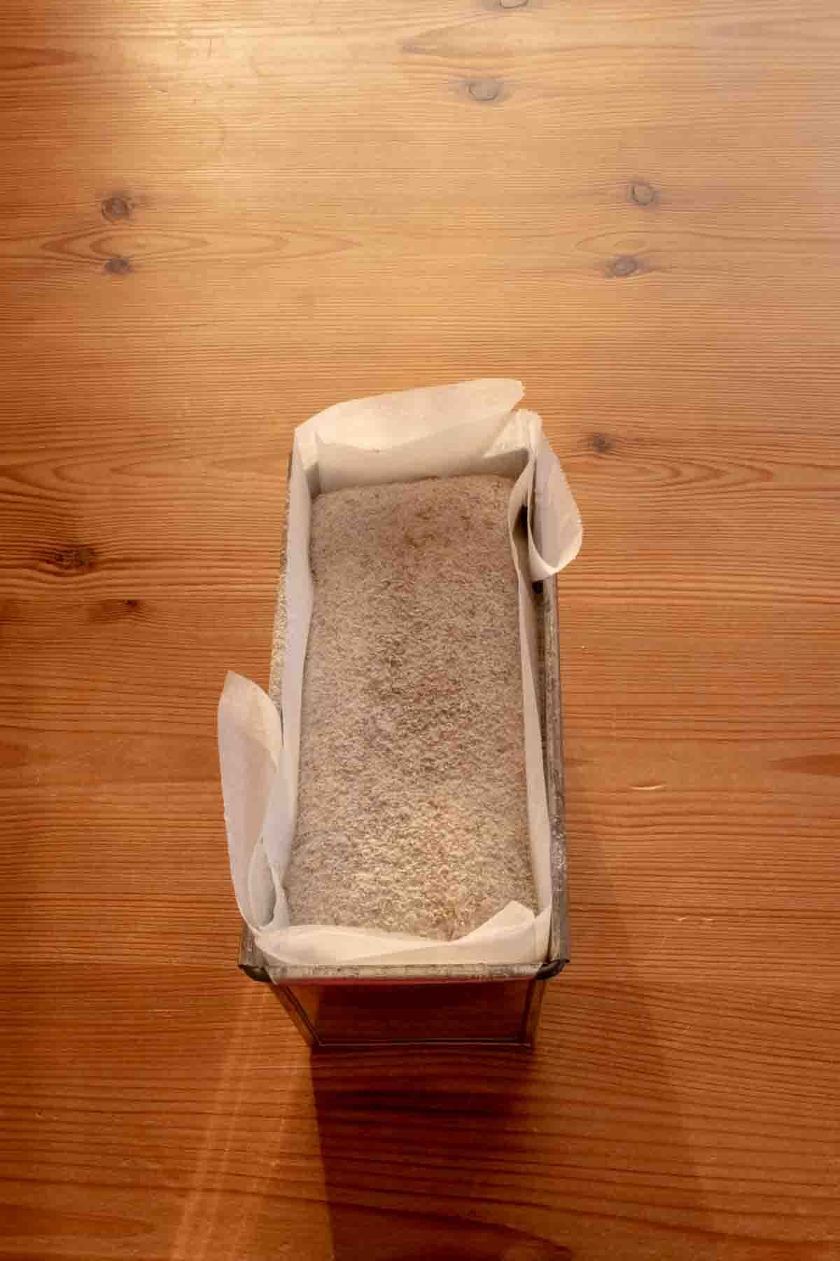 発酵した生地全体に茶漉しでライ麦粉を振るう。