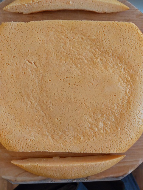 上下の端を少し切り落とし、巻きすにのせ手前に切り落とした部分をのせ手前からしっかり巻き輪ゴムで巻きすを固定し冷めるまでおく。