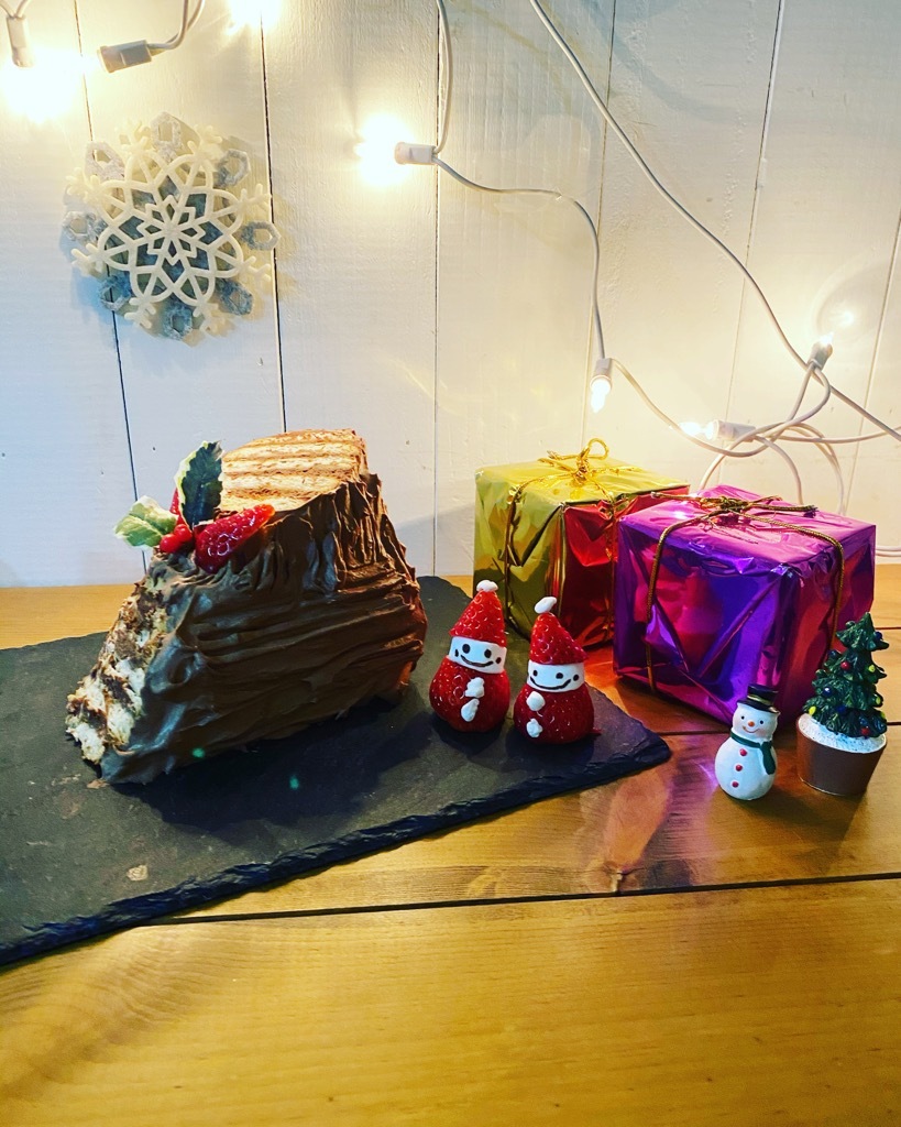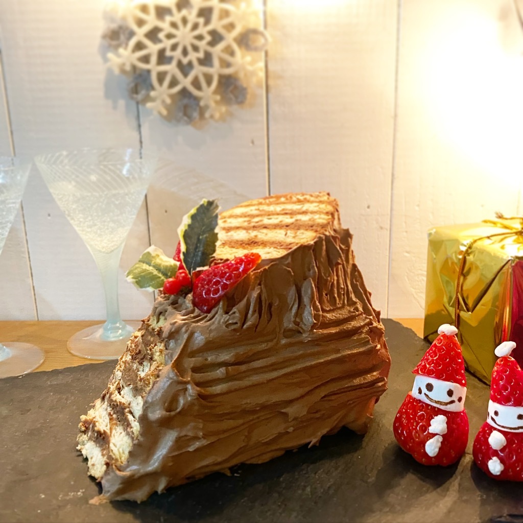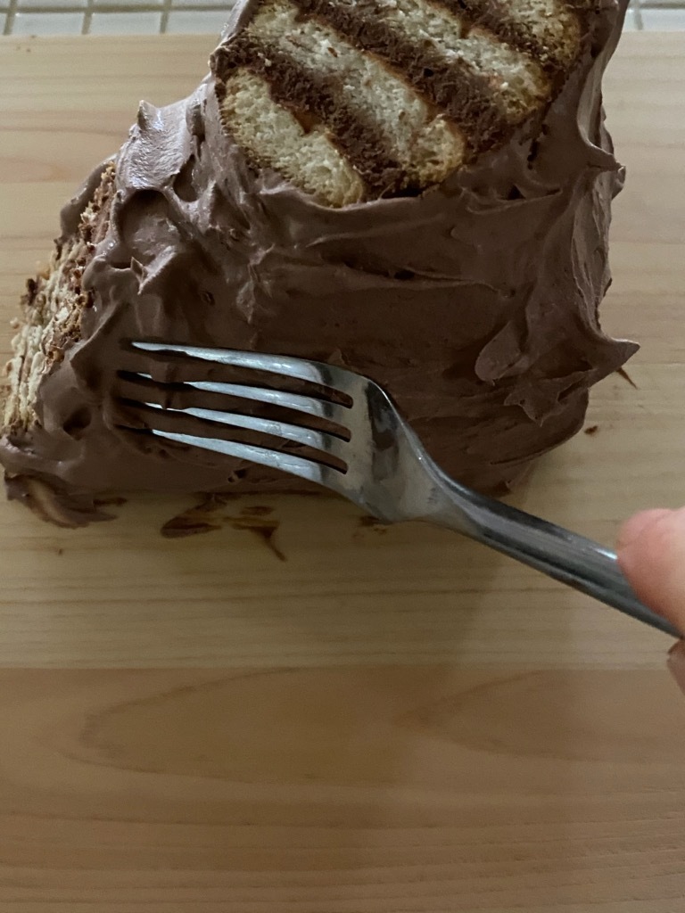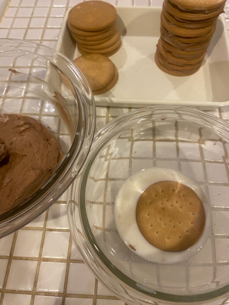ビスケットに牛乳をひたし、泡立てたクリームをのり代わりにして層にして筒状に重ねる。