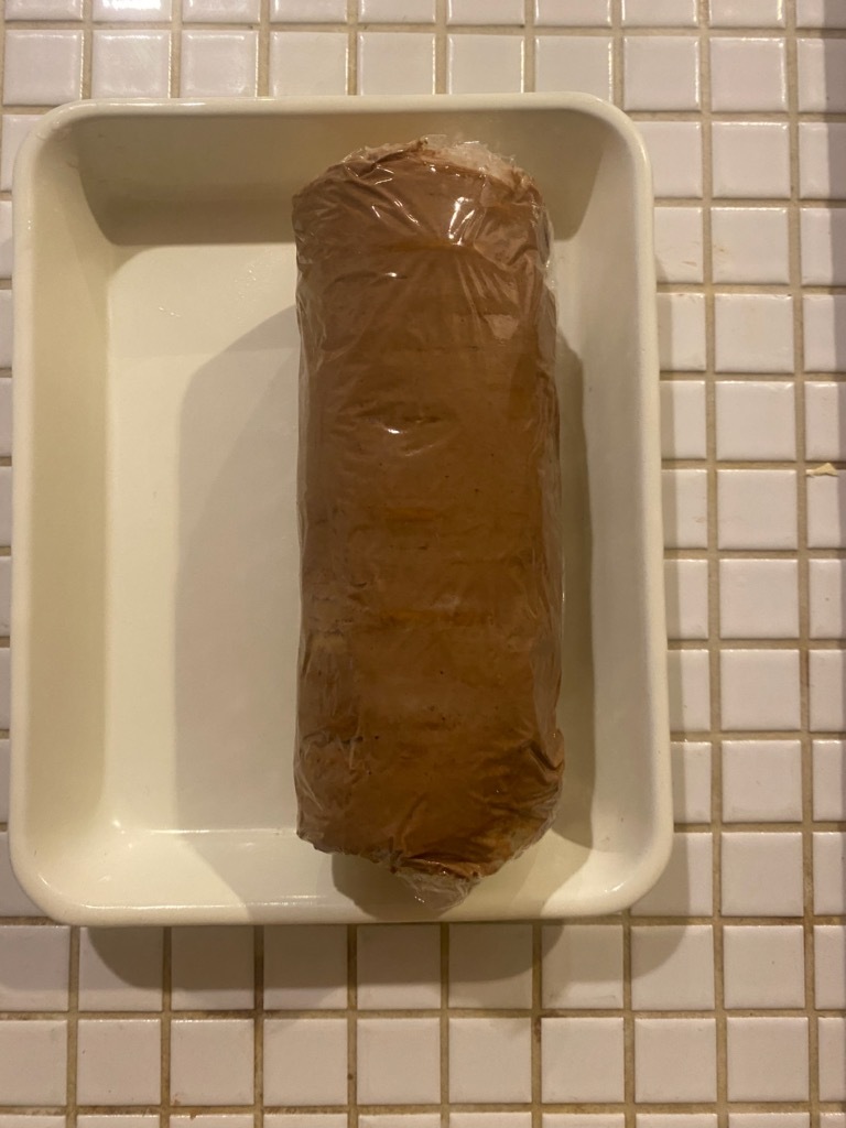 ラップをして冷蔵庫に入れクリームが冷えて固まるまで冷やしたら端を斜めに切る。