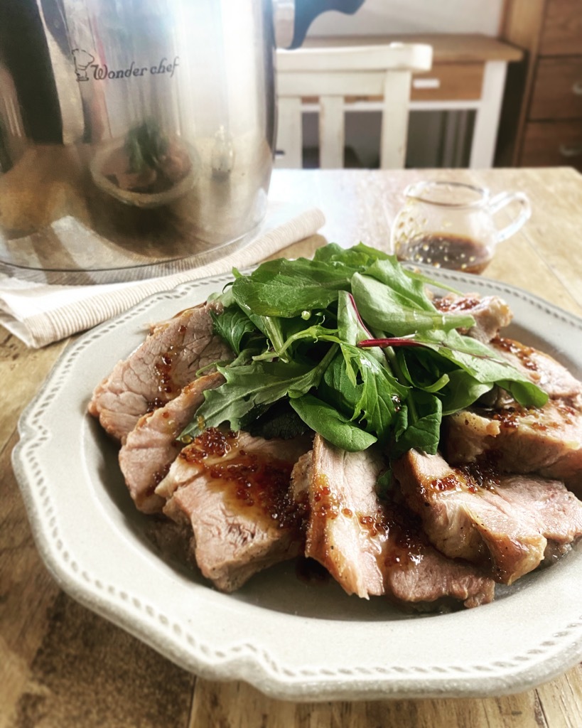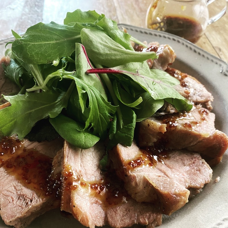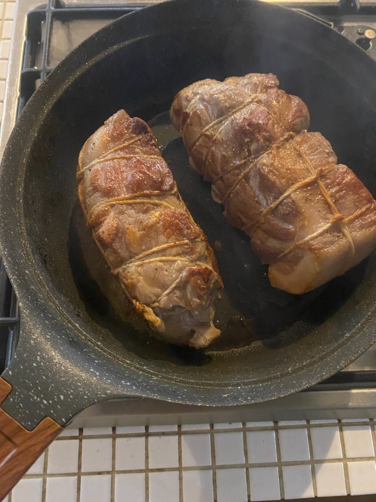 豚肉は塩、胡椒をふり、脂を熱したフライパンで焼き色がつくまで強火で焼く。