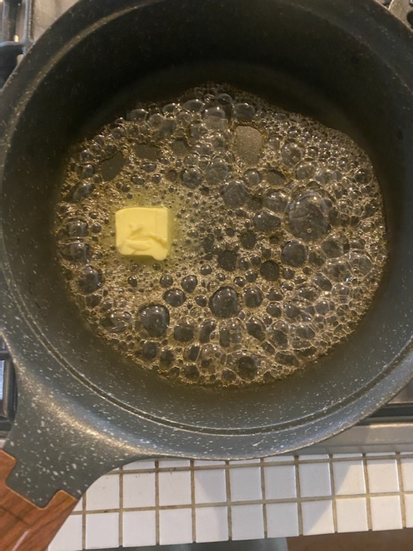 フライパンにはちみつを入れて火にかけ、ふつふつして軽く色づいてきたらバターを加えて溶かす。