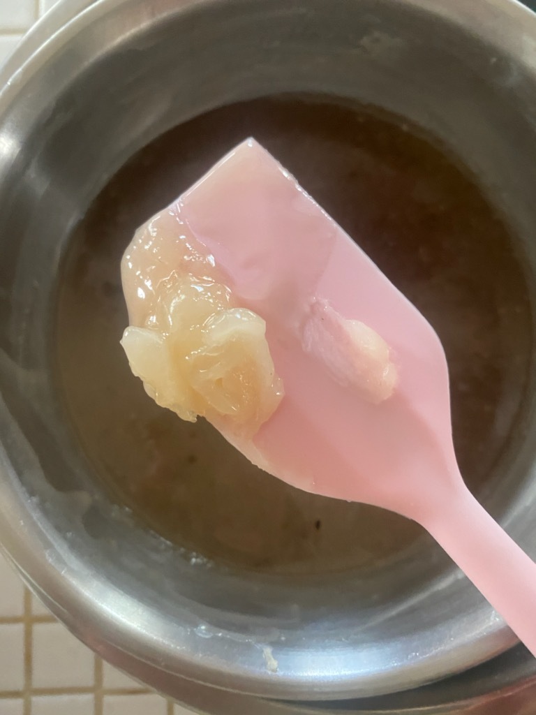 煮汁は冷ますと脂が白く固まってくるので、固まったら脂をのぞきスープなどに使用できる。