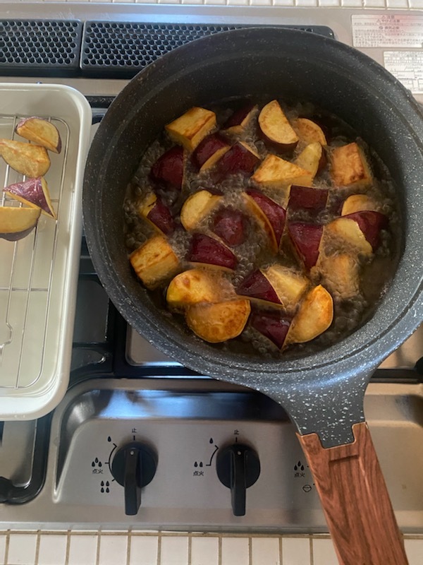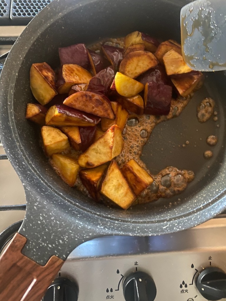 茶色く色づき、大きな気泡になってふつふつしてきたら揚げたさつまいもを加えて全体にからめる。