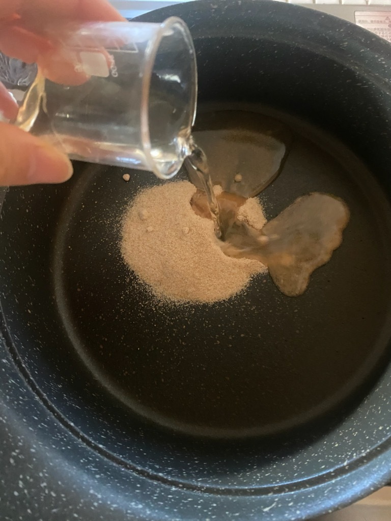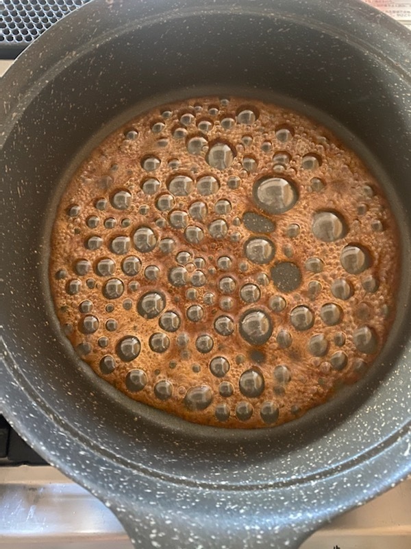 フライパンをきれいにしたら、砂糖、みりん、醤油を入れて火にかける。