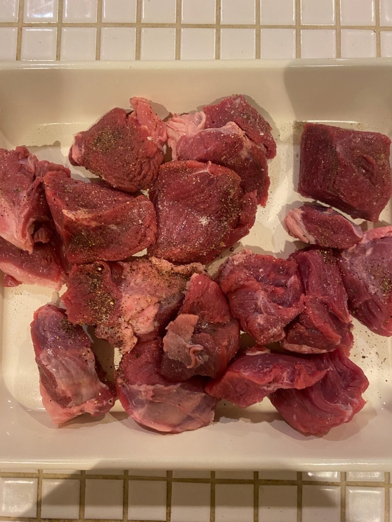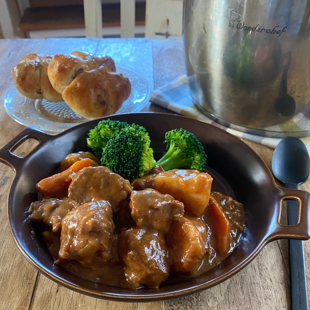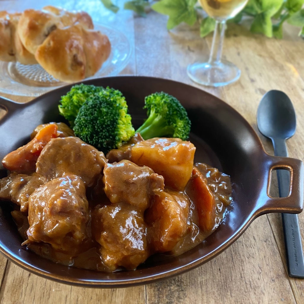 牛肉は3~4cm角に切り塩、胡椒をまぶす。玉ねぎはくし形切り、にんじんは大きめの乱切り、じゃがいもはにんじんと同じくらいに切り、ブロッコリーは子房に切りブロッコリーは塩ゆでする。