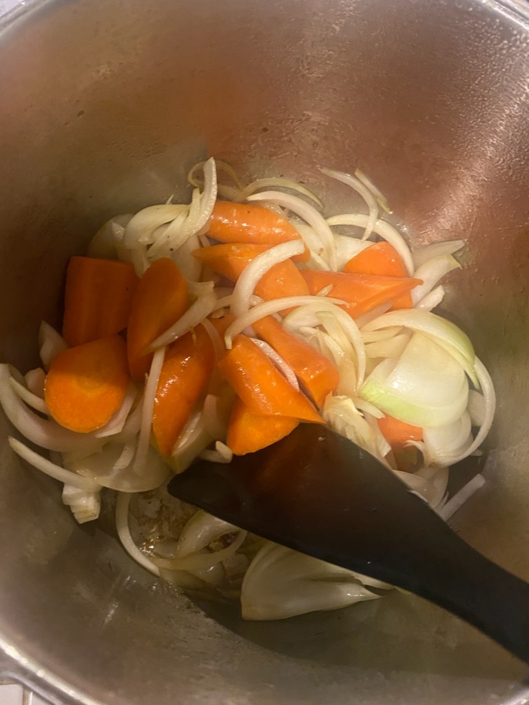 圧力鍋に油を熱し肉を焼き、表面に焼き色がついたらいったん取り出して玉ねぎ、にんじんを炒める